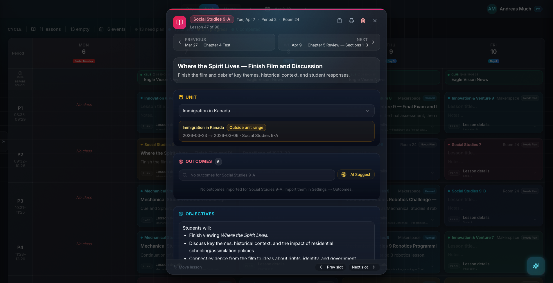 Use the Unit Planner to create a unit, add source material, generate lesson sequences on real dates, and keep outcomes tied to the plan.